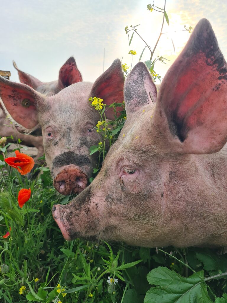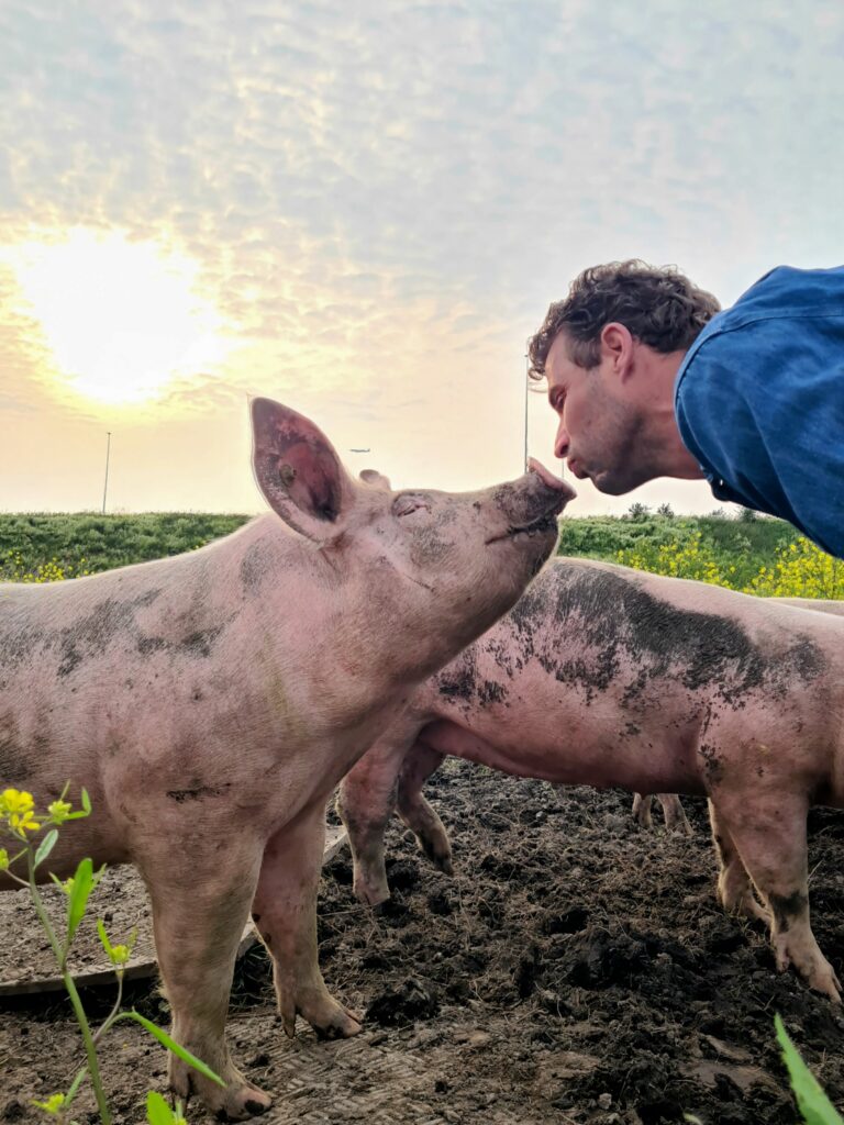 De varkens wroeten bij De Herkomst in de vrije natuur en luieren in het modderbad. Ze worden gevoed met 100% reststromen van o.a. bakkers en telers uit de buurt.